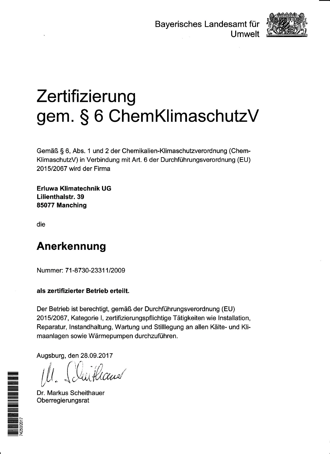 Anerkennung als zertifizierter Betrieb gemäß §6 Chemikalien-Klimaschutzverordnung